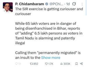 P. Chidambaram’s tweet may have been intended to raise procedural concerns about voter list integrity. However, its language and implications reveal deeper regional biases and constitutional misunderstandings.