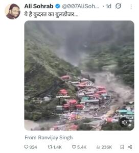 Social media platforms, which often become spaces of solidarity during national tragedies, were tainted by the likes of Ali Sohrab and Karishma Aziz, online figures whose reactions to the flooding showcased not concern, but gloating. Using phrases like nature’s bulldozer, they twisted a natural calamity into a malicious narrative of vengeance, attempting to frame the floods as a divine backlash against Hindus and the state’s governance.
