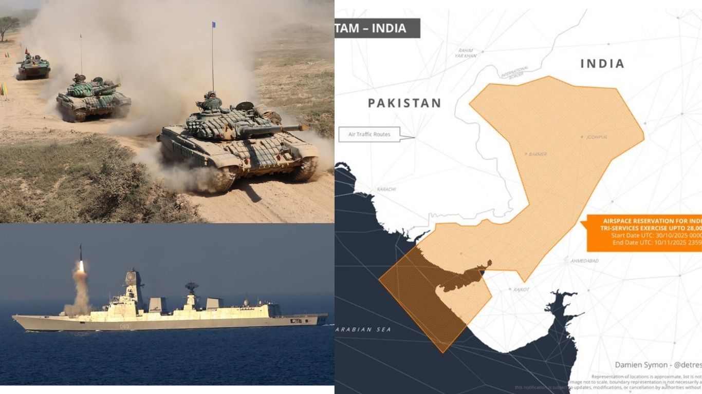 India has issued a large-scale Notice to Airmen (NOTAM) along the Pakistan border for an upcoming tri-services military exercise involving the Indian Army, Navy, and Air Force a move that signals New Delhi’s assertive military posture following heightened regional tensions after Operation Sindoor. Scheduled from October 30 to November 10, the exercise named “Ex Trishul” will test India’s joint warfare capabilities across land, air, and sea. But what makes this development truly striking is the unusual scale and location of the drills, encompassing sectors rarely activated together, from the Rann of Kutch’s creek areas to the Arabian Sea off the Saurashtra coast. The reservation of airspace up to 28,000 feet, as revealed by satellite imagery analysts, underscores a high level of operational intensity.