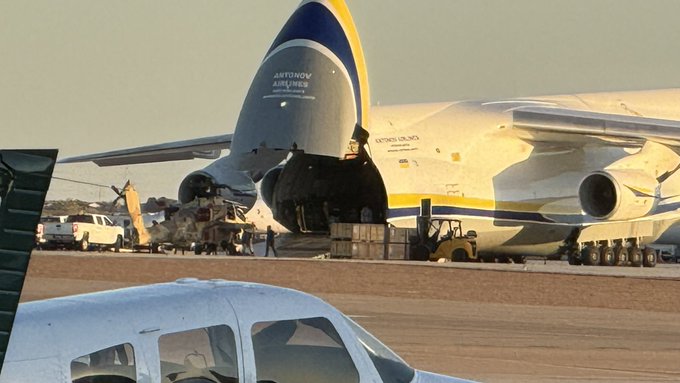 After returning to the United States, the Apaches were unloaded from the Antonov aircraft. Images showed the helicopters being towed on the ground with their rotor blades removed.