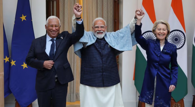 The signing and exchange of the political declaration marking the conclusion of negotiations for the India-EU Free Trade Agreement took place in the presence of Prime Minister Narendra Modi, the President of the European Commission Ursula Von Der Leyen, and the President of the European Council António Luís Santos da Costa.