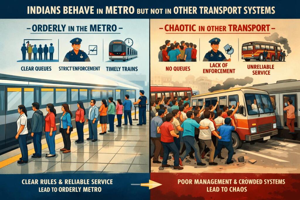 Ultimately, the question of why Indians fall in line in metros but not in other transport systems is not about a deficit of civic sense, but about the conditions that either enable or hinder its expression. By addressing these conditions thoughtfully, urban planners and policymakers can help extend the culture of order and predictability seen in metros across the full spectrum of India’s public transportation landscape — making daily commutes smoother, safer, and more equitable for all.