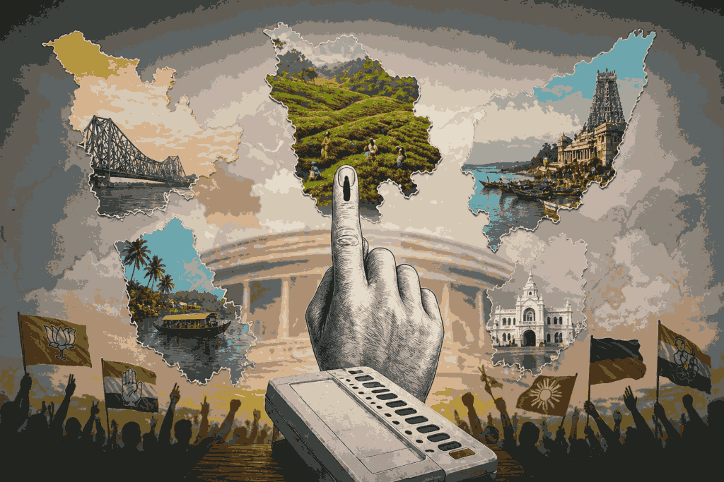 Exit polls for the 2026 Assembly elections have triggered intense political debate after several survey agencies projected a strong performance for the Bharatiya Janata Party-led alliance across multiple states. While final results will only be declared on May 4, early trends suggest the possibility of an NDA sweep in Assam and Puducherry, with major gains also predicted in West Bengal. Tamil Nadu and Kerala, however, appear to present more mixed verdicts.