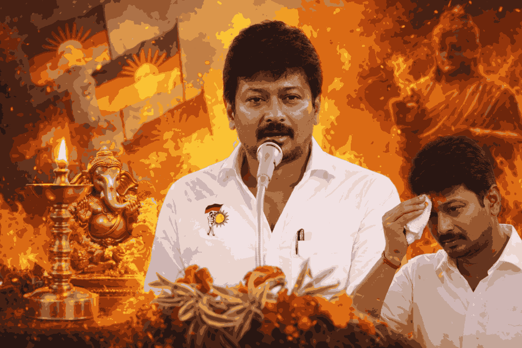 The controversy surrounding Tamil Nadu Deputy Chief Minister Udhayanidhi Stalin has once again ignited a nationwide debate, this time after visuals surfaced showing him wiping off kumkum from his forehead at a public event. The incident has been interpreted by critics as a symbolic affront to Hindu Dharma, further deepening an already polarised discourse that began with his earlier remarks on Sanatana Dharma.